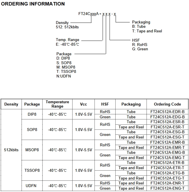 FT24C512A-ETR-T是一款512K位(65,536字節)的串行EEPROM芯片,采用標準的兩線雙向串行接口。它支持1.8V至5.5V的寬電壓范圍,適用于多種低電壓和低功耗應用。該芯片具有128字節的頁寫模式,支持部分頁寫操作,確保數據寫入的靈活性和高效性。