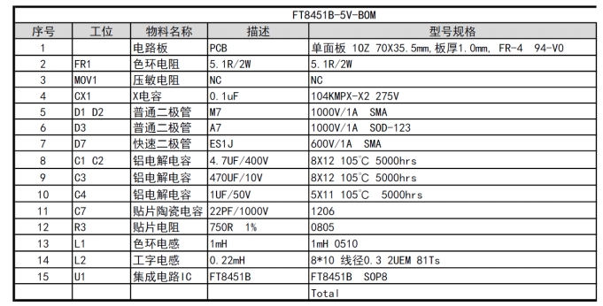 FT8451B的物料清單簡潔明了,主要包括以下幾個(gè)關(guān)鍵元件: