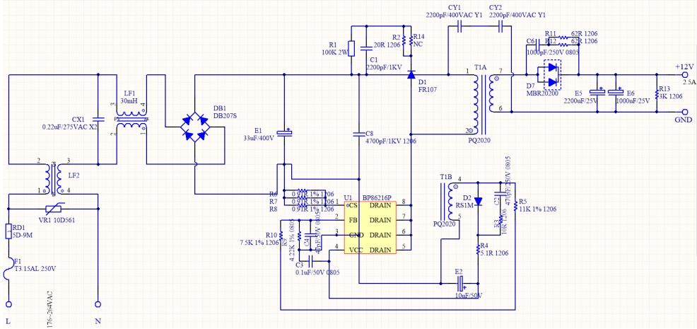 BP86216P 12V2.5A 電源方案以其高效率、低待機(jī)功耗和優(yōu)異的動(dòng)態(tài)響應(yīng)能力,成為 30W 功率段家用電器電源的理想選擇。其簡(jiǎn)潔的電路設(shè)計(jì)和緊湊的 PCB 布局,不僅降低了生產(chǎn)成本,還提高了產(chǎn)品的可靠性和一致性。無(wú)論是用于路由器、機(jī)頂盒還是其他小型家用電器,BP86216P 都能提供穩(wěn)定可靠的電源支持。