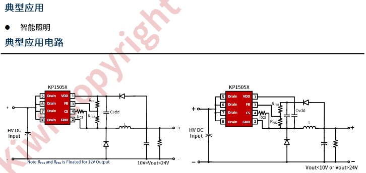 | KP15052SPA | 5 Ω | 12 V (FB懸空) | 350 mA | 6-8 W | 吸頂燈 / 筒燈輔光 |