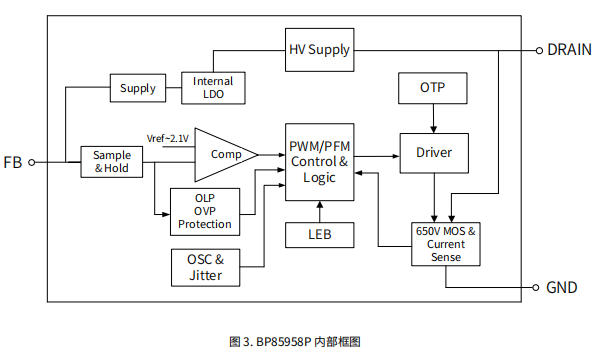 BP85958P用一顆DIP7就把650V MOSFET、高壓啟動、固定12V反饋、全套保護全部集成: