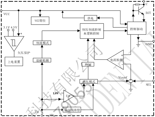 LP3717的內(nèi)部結(jié)構(gòu)框圖揭示了其自供電與恒壓恒流控制的實(shí)現(xiàn)機(jī)制: