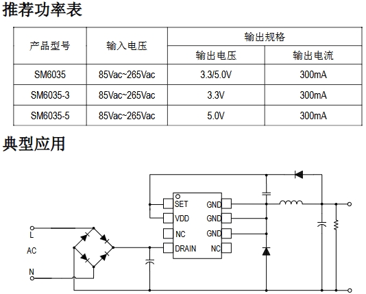 SM6035-X 是一款高精度非隔離、高集成度且低成本的降壓恒壓控制芯片,適用于 85Vac~265Vac 全電壓范圍應用;SM6035-X 內(nèi)部集成500V高壓功率管,內(nèi)置 CS 電阻,無需外部補償元件,即可實現(xiàn)優(yōu)異的線性調(diào)整率和負載調(diào)整率,外圍元件極少,大大的降低了系統(tǒng)的成本,節(jié)約了PCB的尺寸。SM6035-X 應用于多種供電電源領(lǐng)域,提供3.3/5V 兩種規(guī)格輸出電壓。同時芯片集成有完備的保護功能,過溫保護、過壓保護、欠壓保護等,保證了系統(tǒng)的可靠性。
